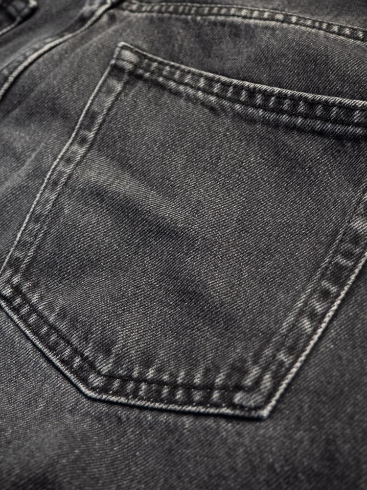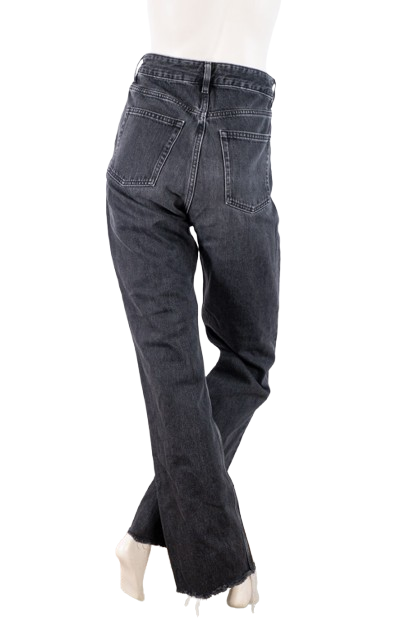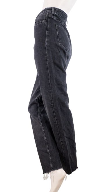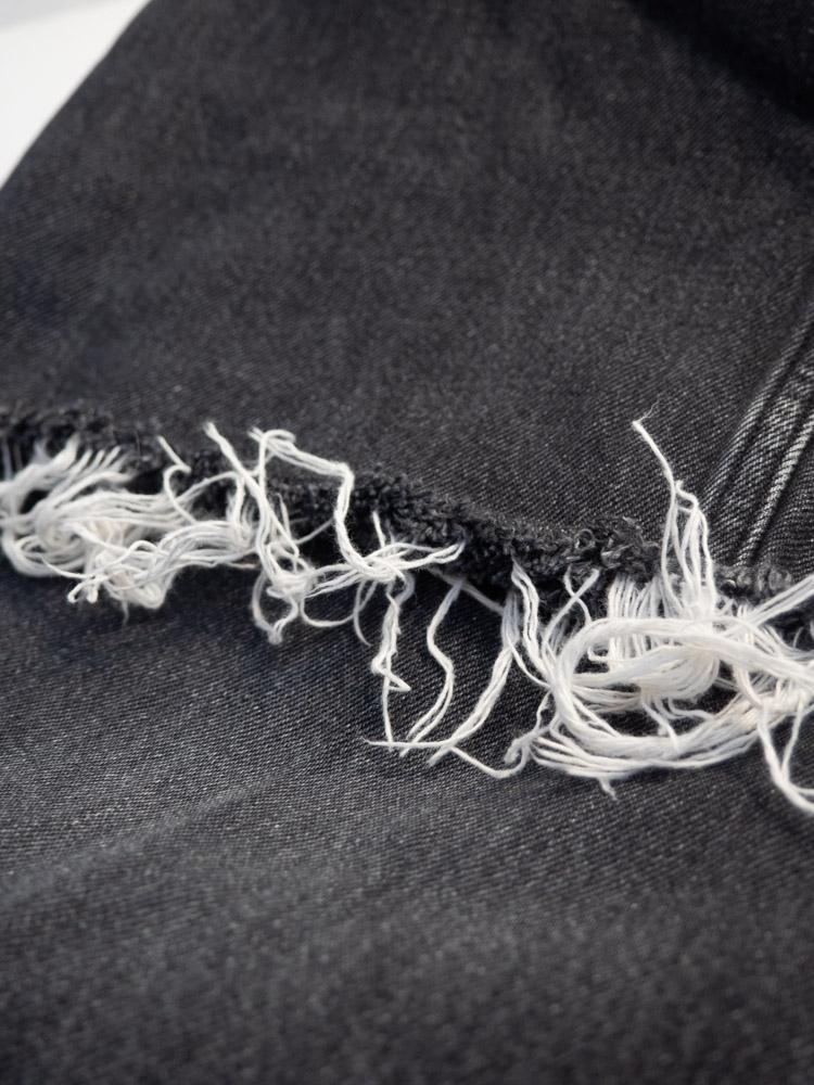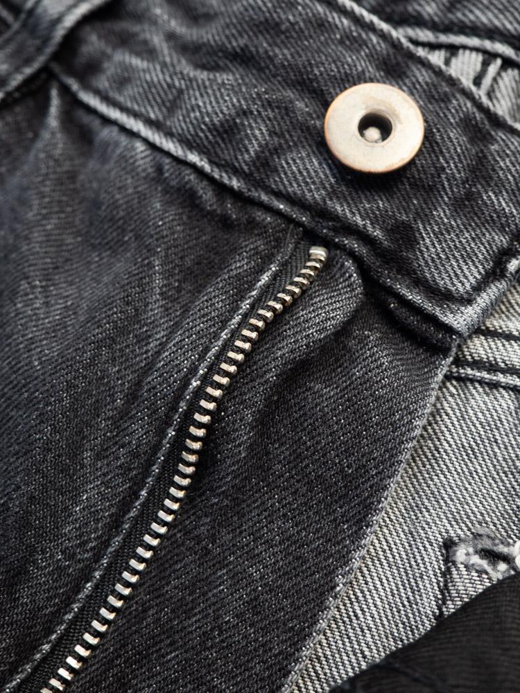 Jeansy w szaro-czarnym kolorze. Nogawka prosta szeroka zakończona frędzlami.