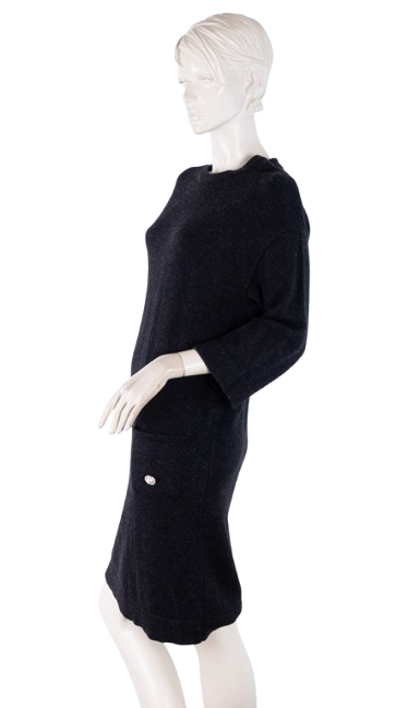 Dzianinowa sukienka w grafitowym kolorze. Posiada kieszonki ozdobione guzikami.