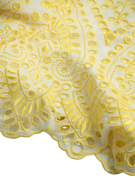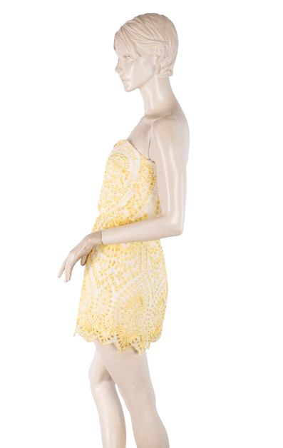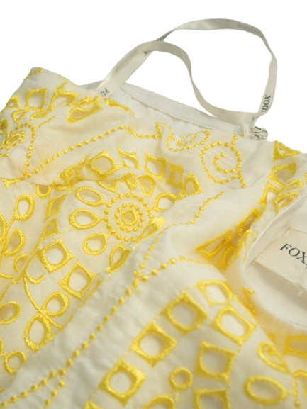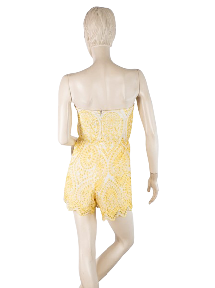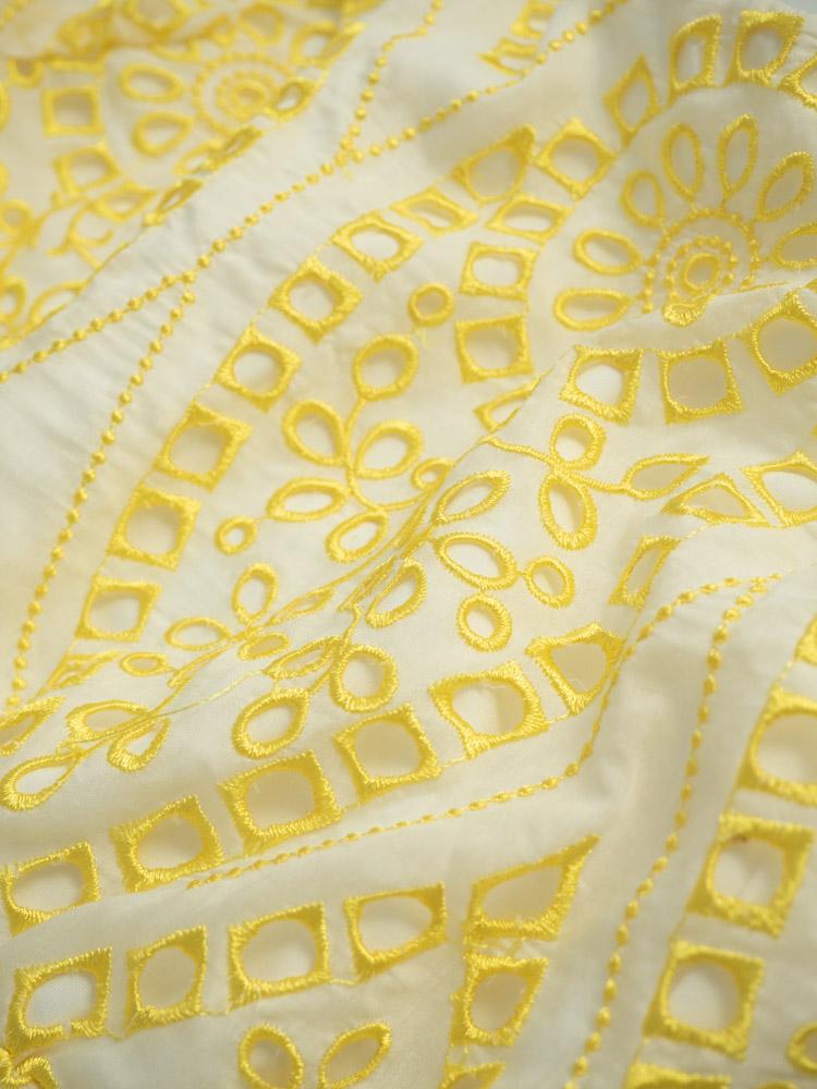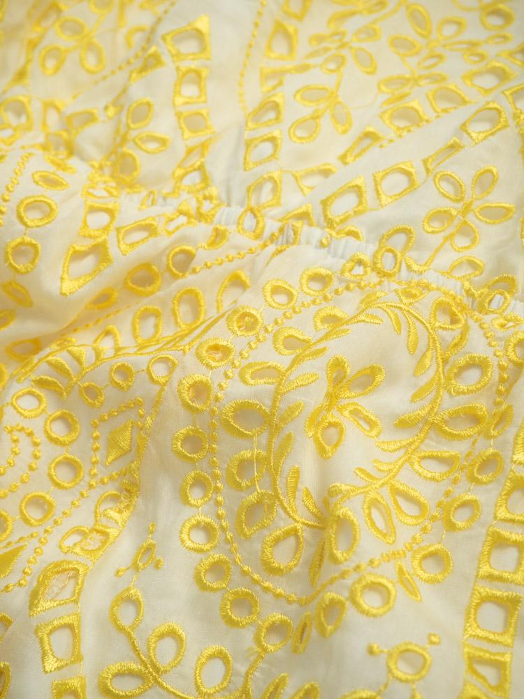 Letni kombinezon w kolorze ecru. Ozdobiony żółtym haftem.