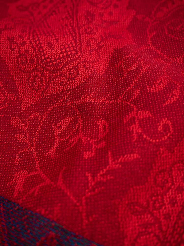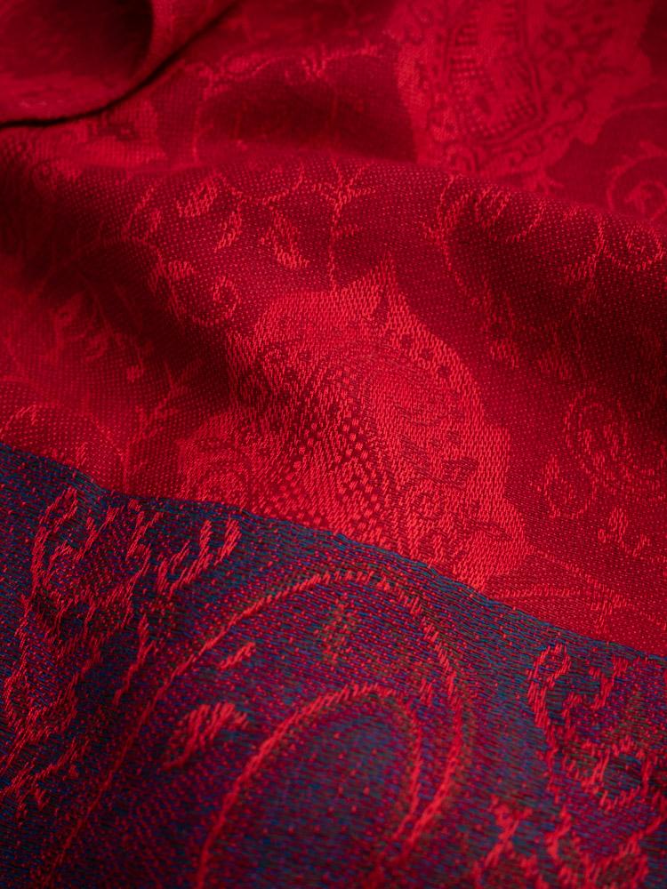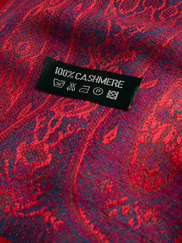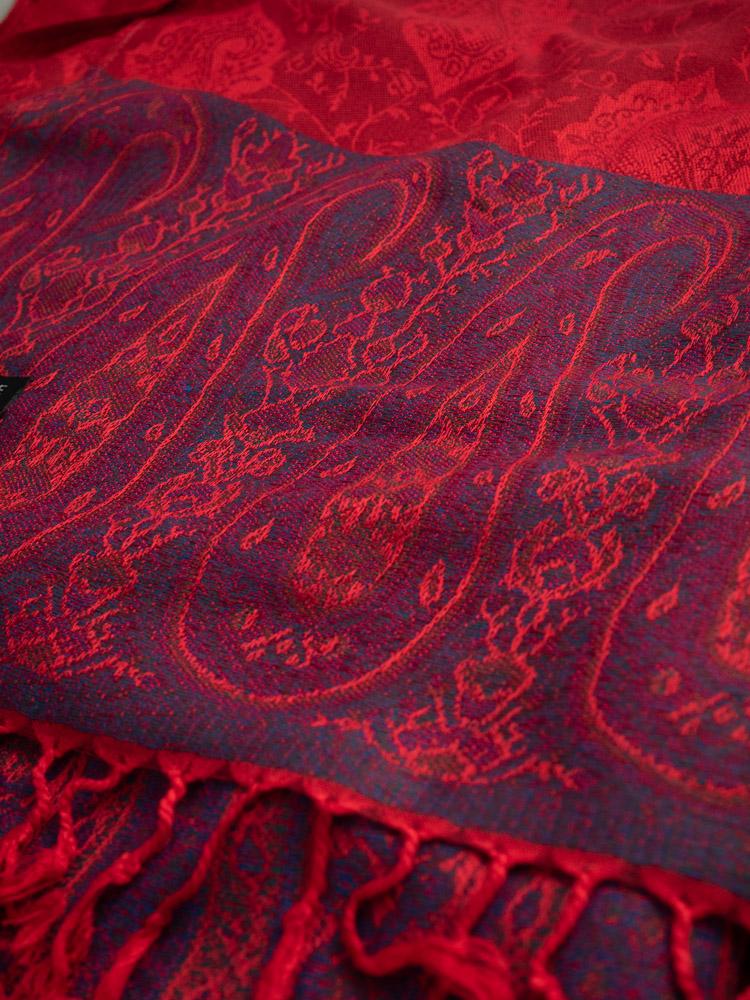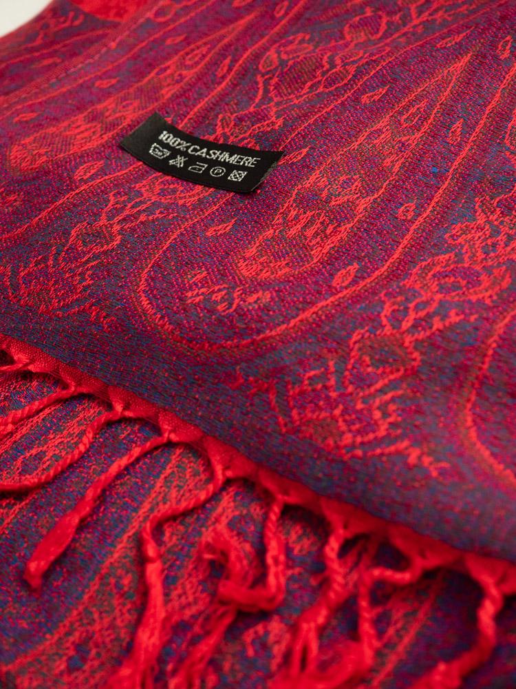 Kaszmirowy szal w czerwinym kolorze. Ozdobiony błękitno-fioletowymi wstawkami.