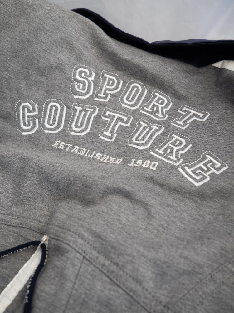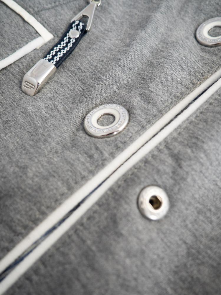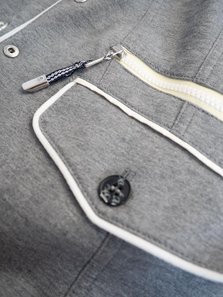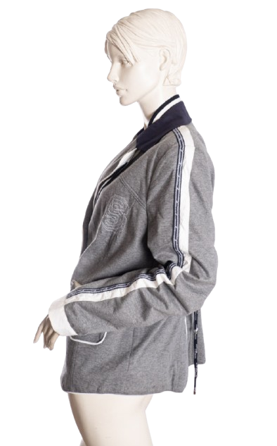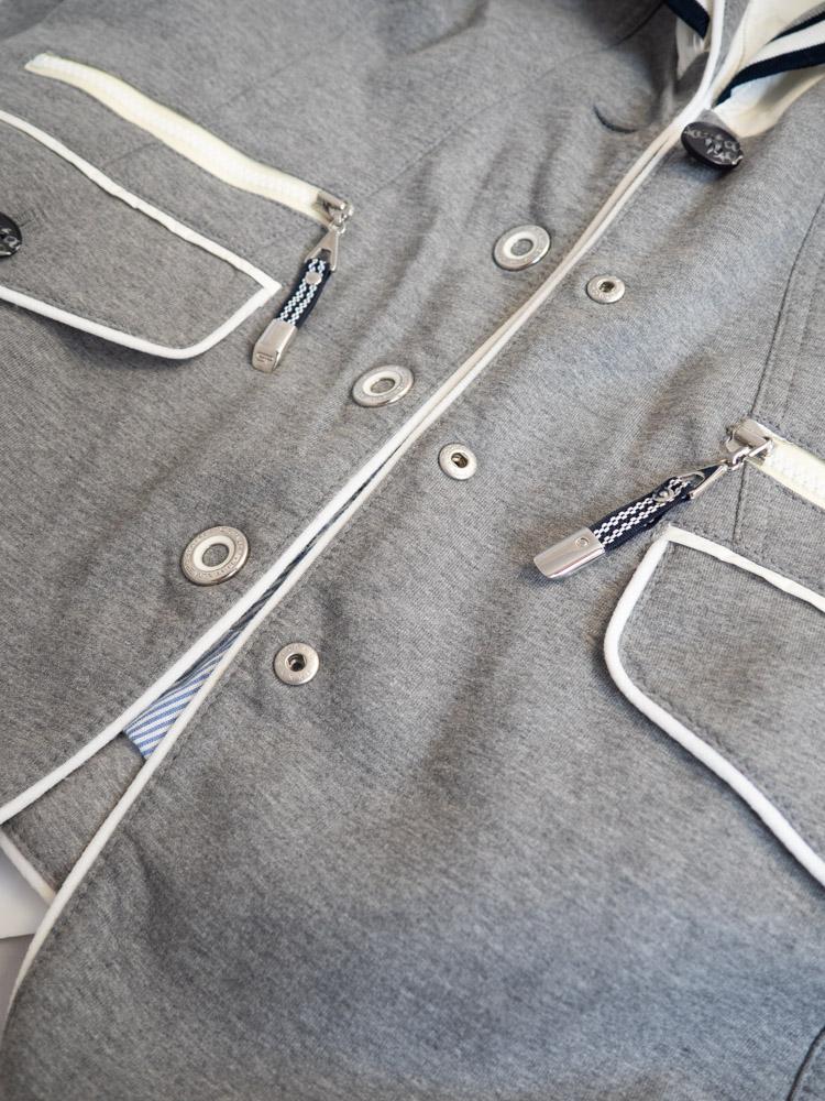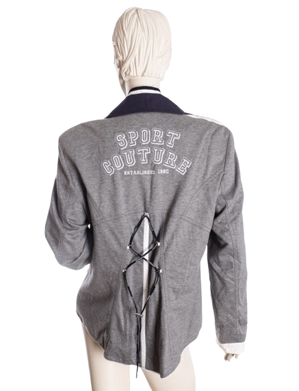Luksusowa marynarka w szarym kolorze z dresowego materiału.