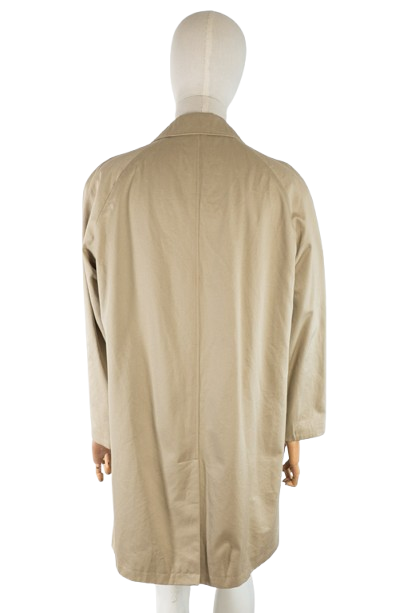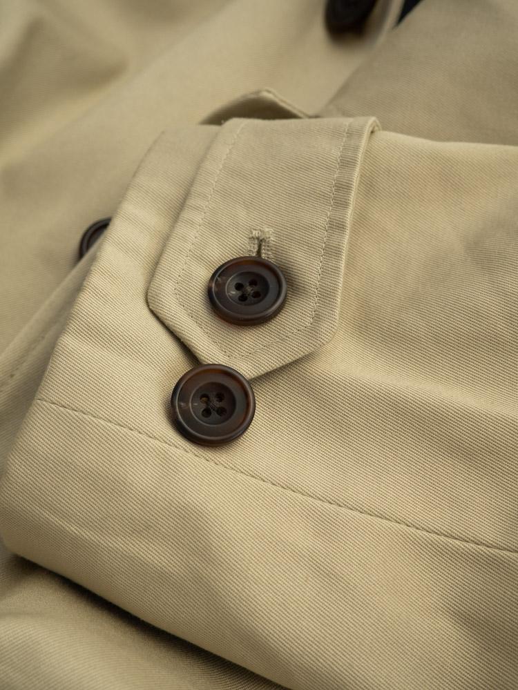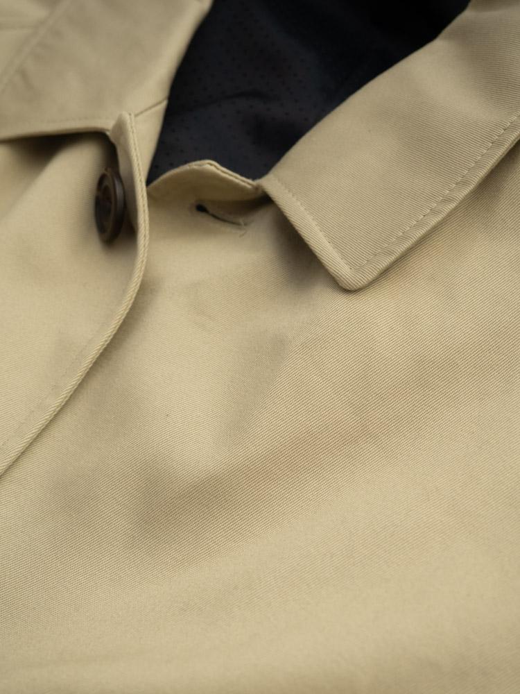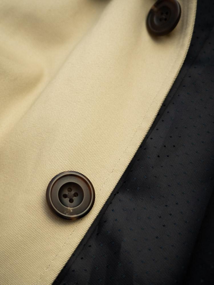 Klasyczny męski płaszcz o ponadczasowym kroju Kolor beżowy, zapinany na czekoladowe guziki.