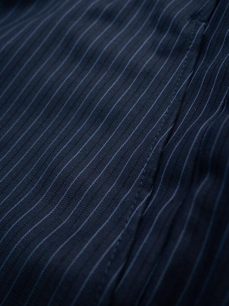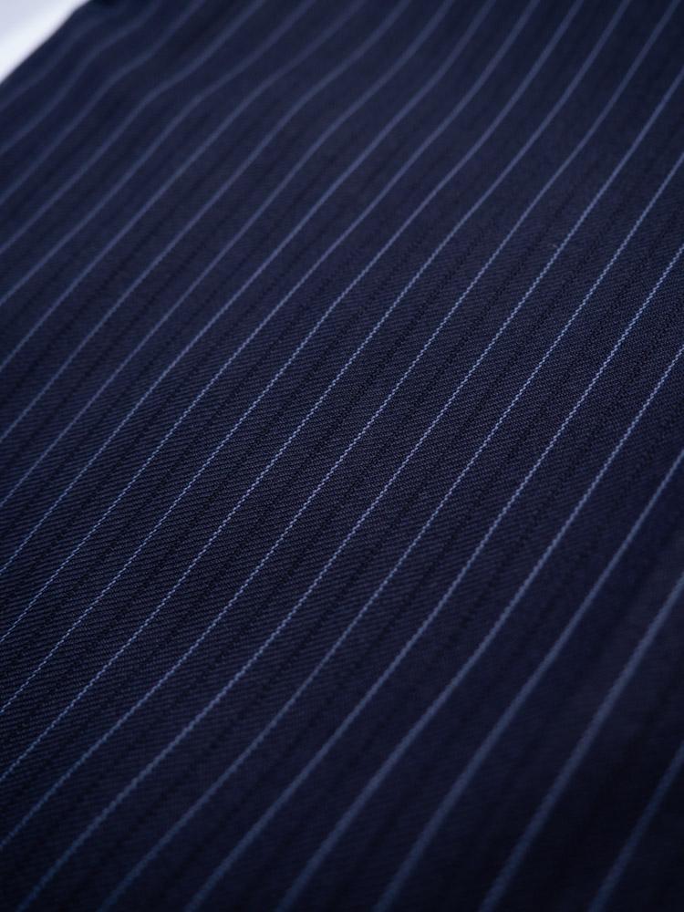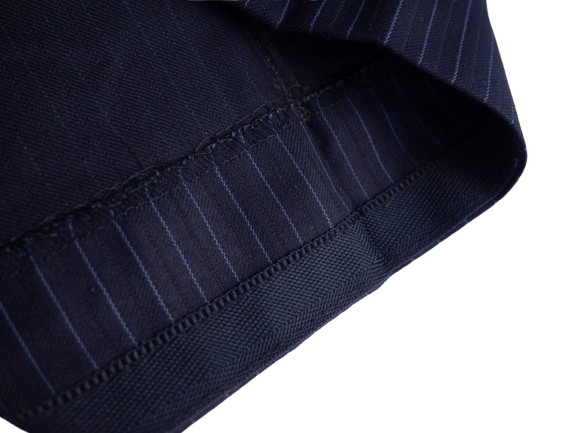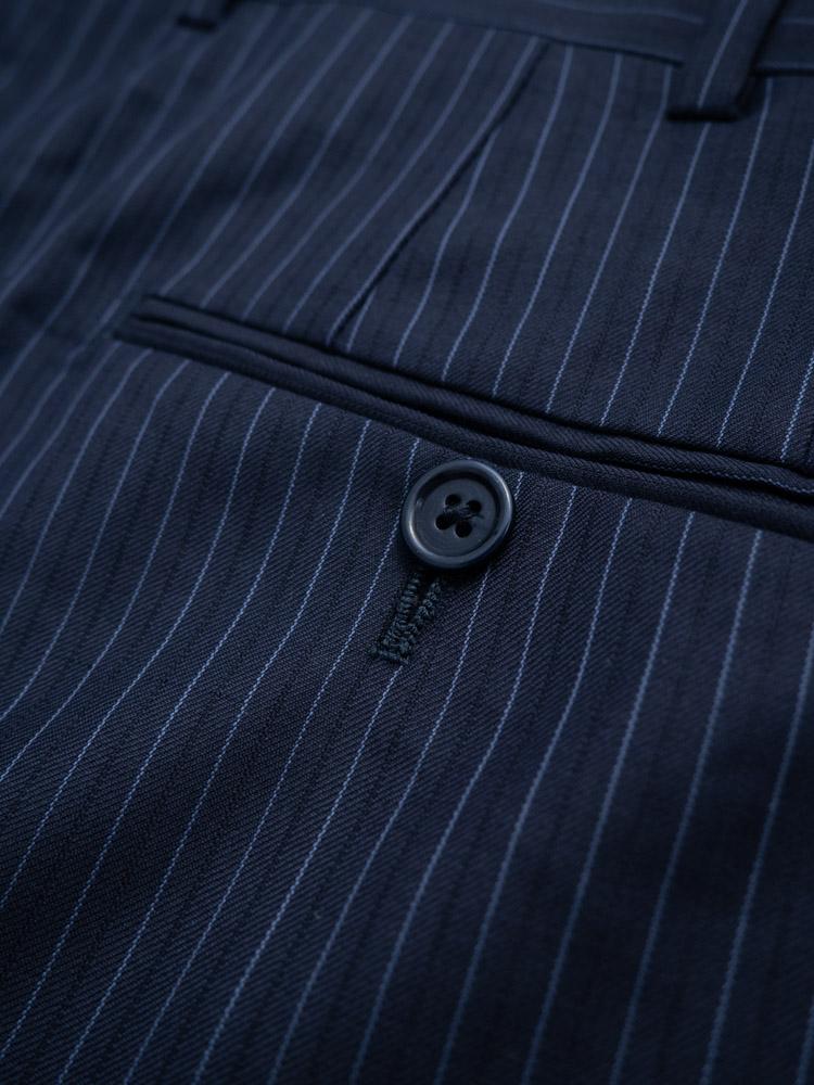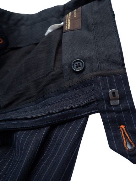 Luksusowe wełniane spodnie w granatowym kolorze. Ozdobione delikatnymwzorem w paski.